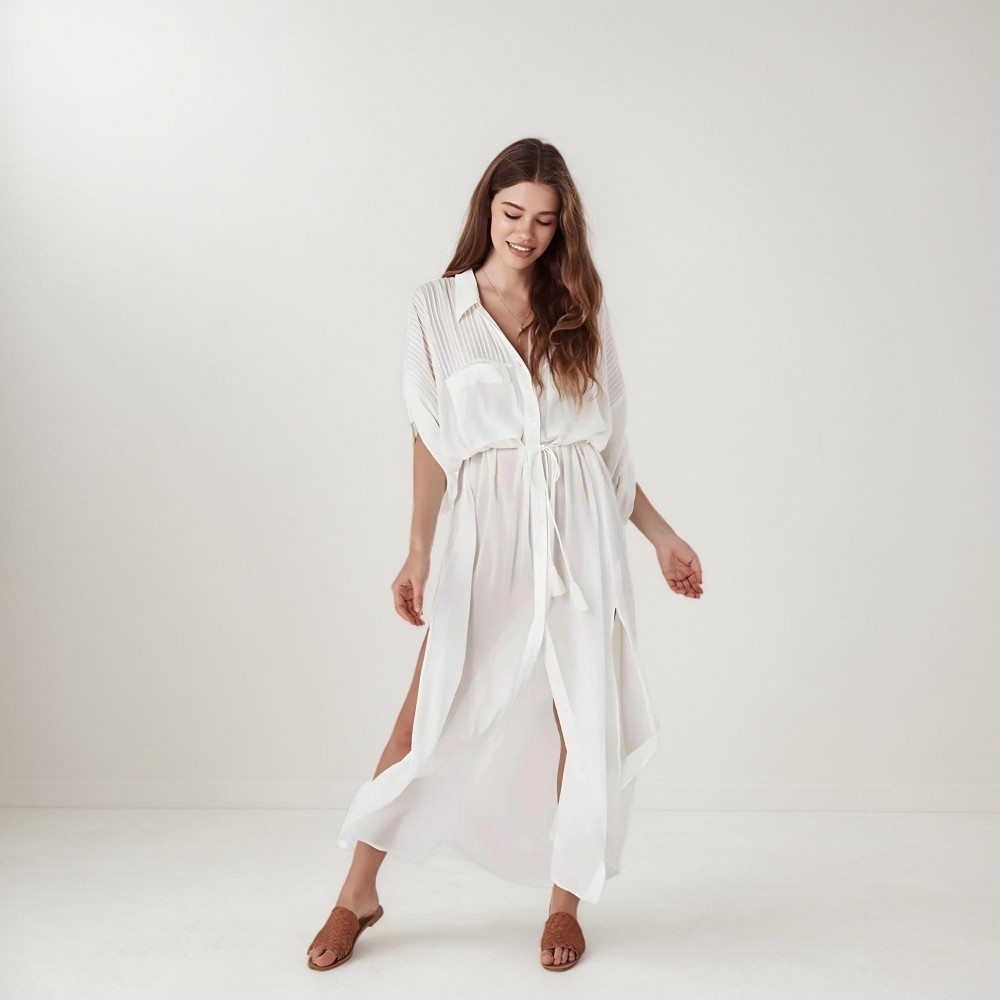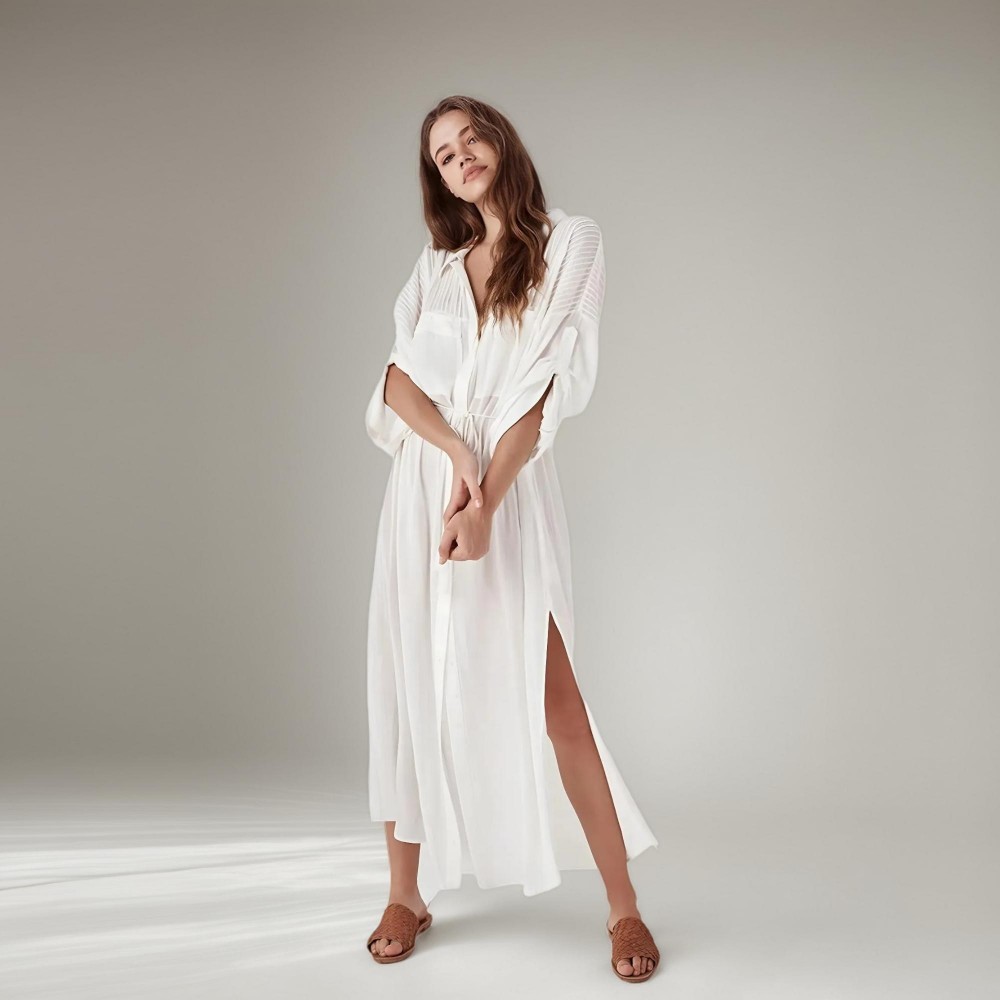 Пляжное длинное платье-рубашка. Рукав длинный, можно регулировать его длину. Застёгивается рубашка на пуговицы. Ткань 100% коттон, хорошо сохнет. Подойдёт на размер S-XL