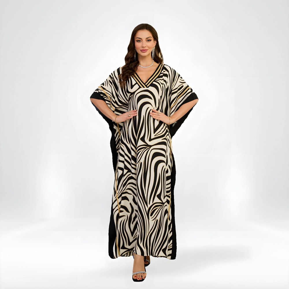 Принт в стиле зебры мгновенно притягивает взгляды и делает образ выразительным. V-образный вырез визуально вытягивает силуэт, а контрастные чёрно-бежевые линии с золотистыми элементами добавляют нотки роскоши. Туника легко сочетается с купальником, соломенной шляпой и босоножками — всё для стильного пляжного образа.