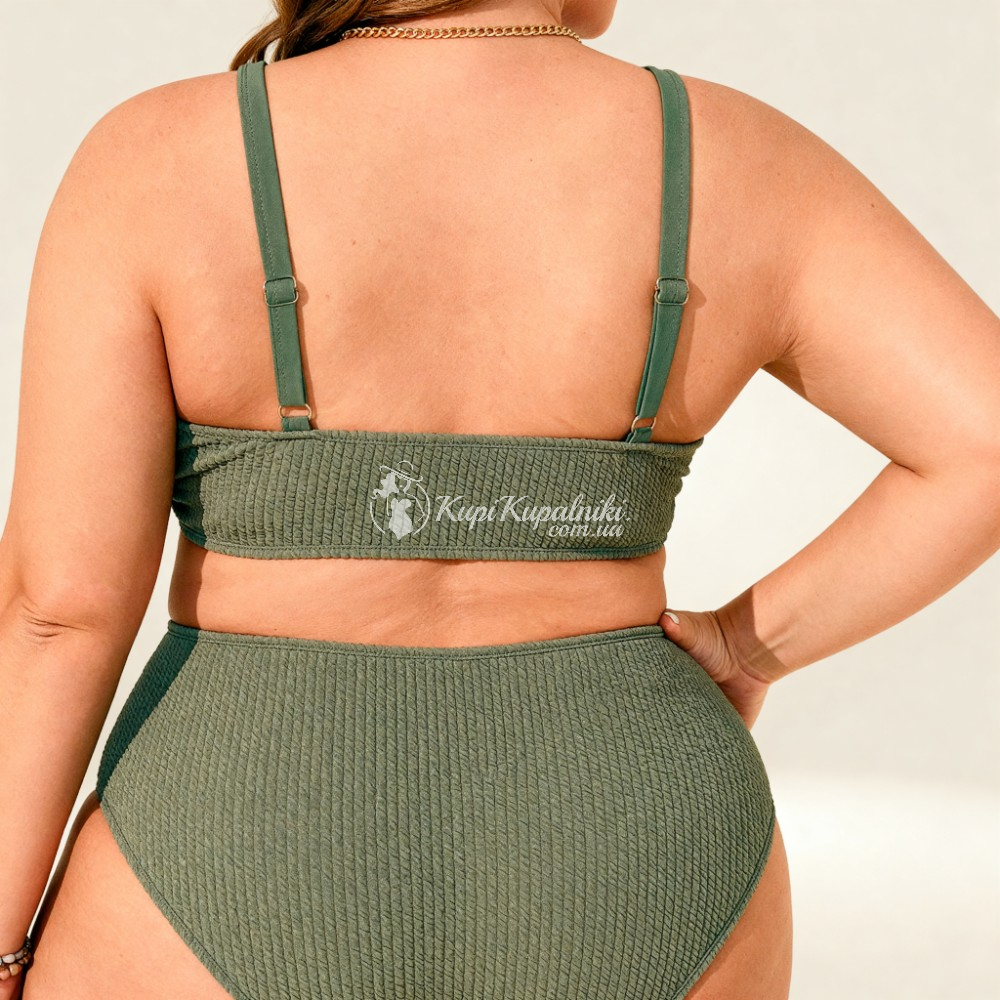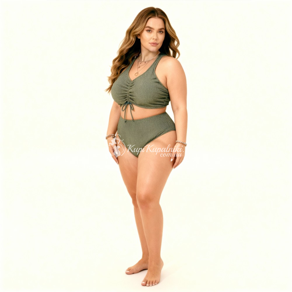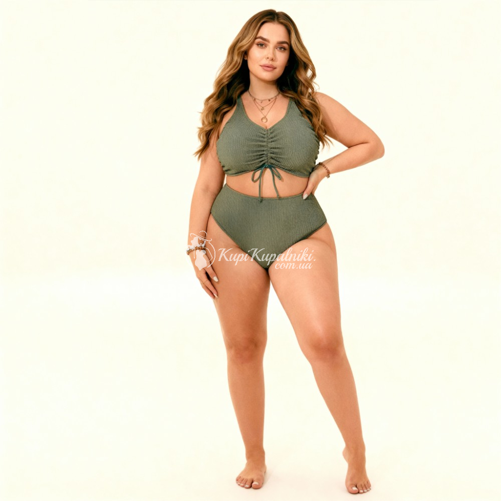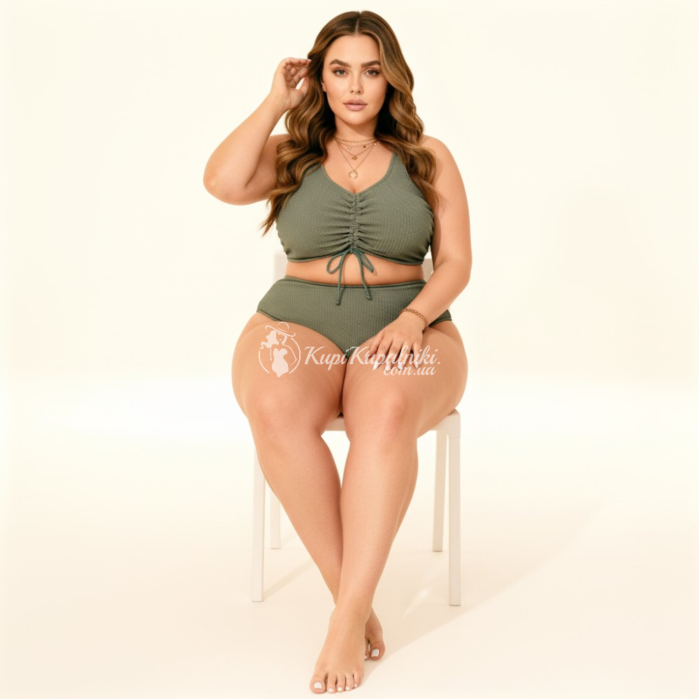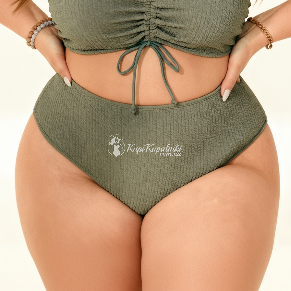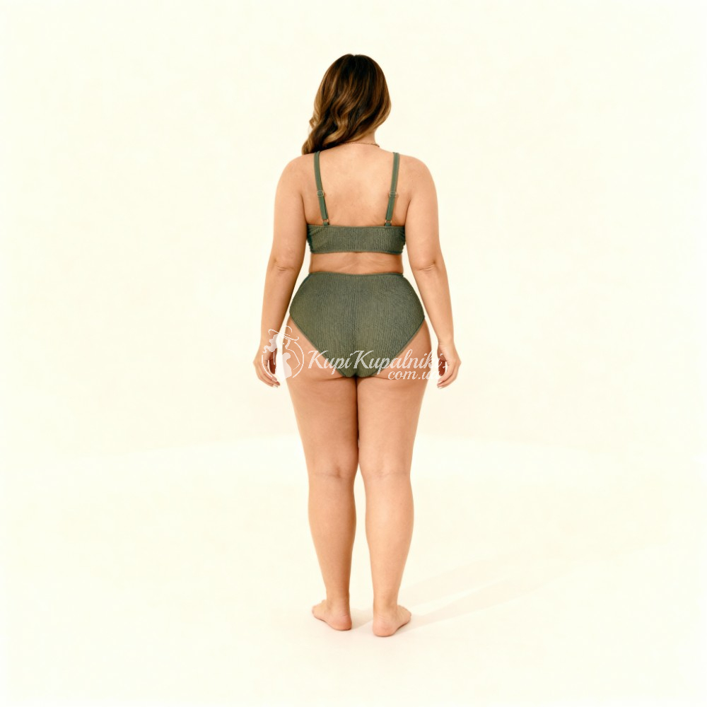 Раздельный купальник Plus Size оливковый с текстурой, сборкой и высокой посадкой 434-08