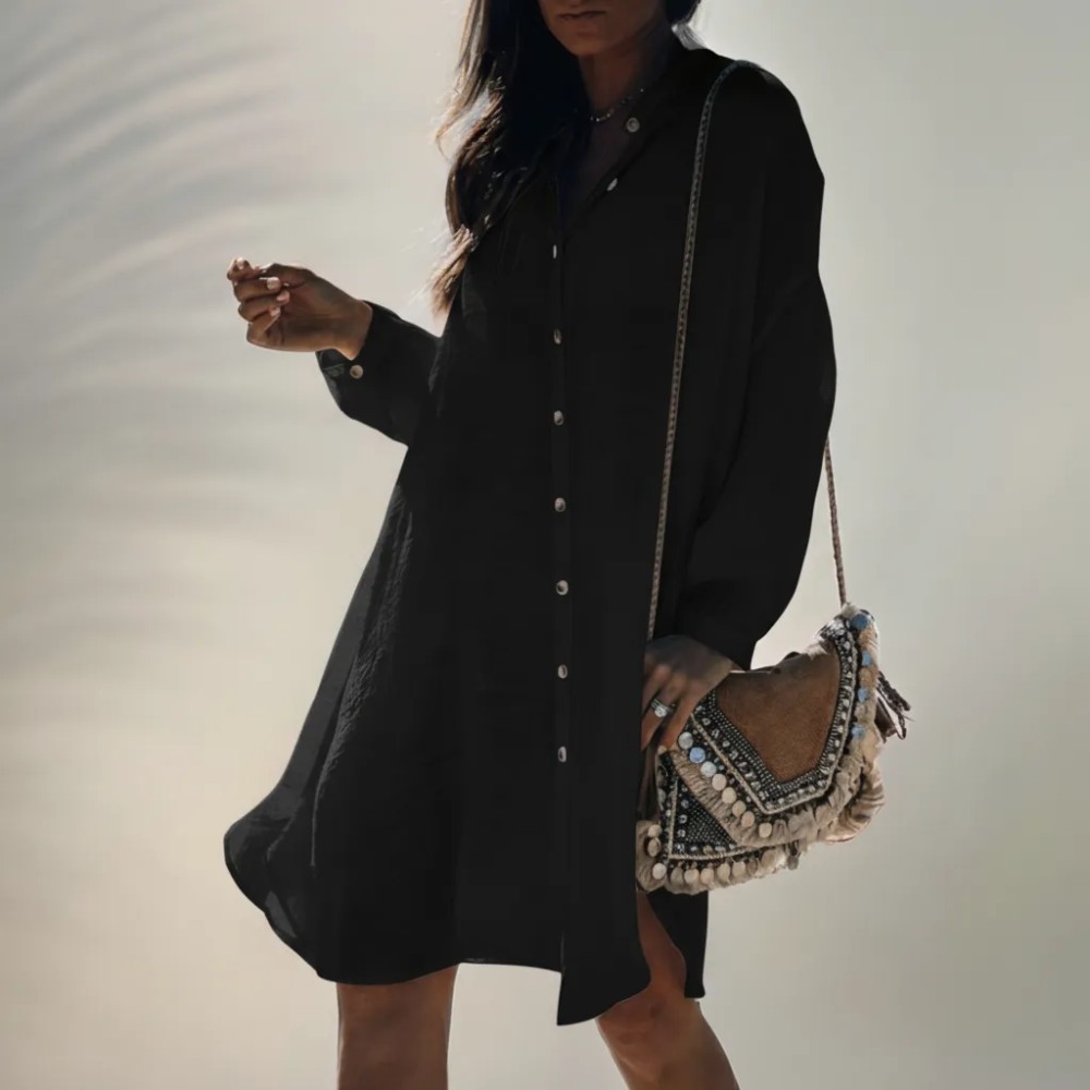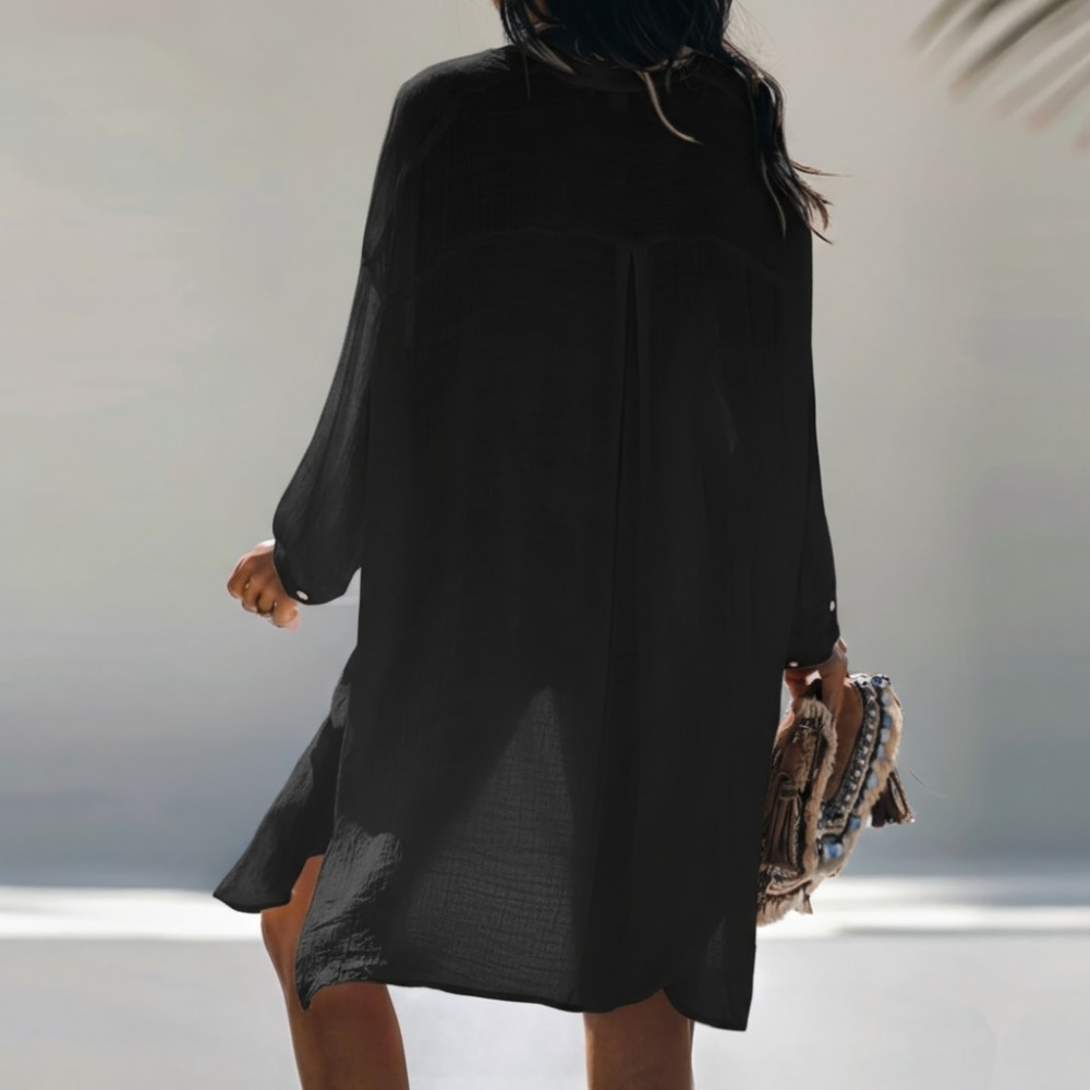 Лёгкая и воздушная туника-рубашка из 100% полиэстера сочетает в себе комфорт, элегантность и практичность. Полупрозрачная ткань отлично пропускает воздух, обеспечивая прохладу даже в самые жаркие дни, а свободный крой и длинные рукава создают непринуждённый, но аккуратный образ. Застёжка на пуговицах позволяет носить её как платье, так и накидку поверх купальника.