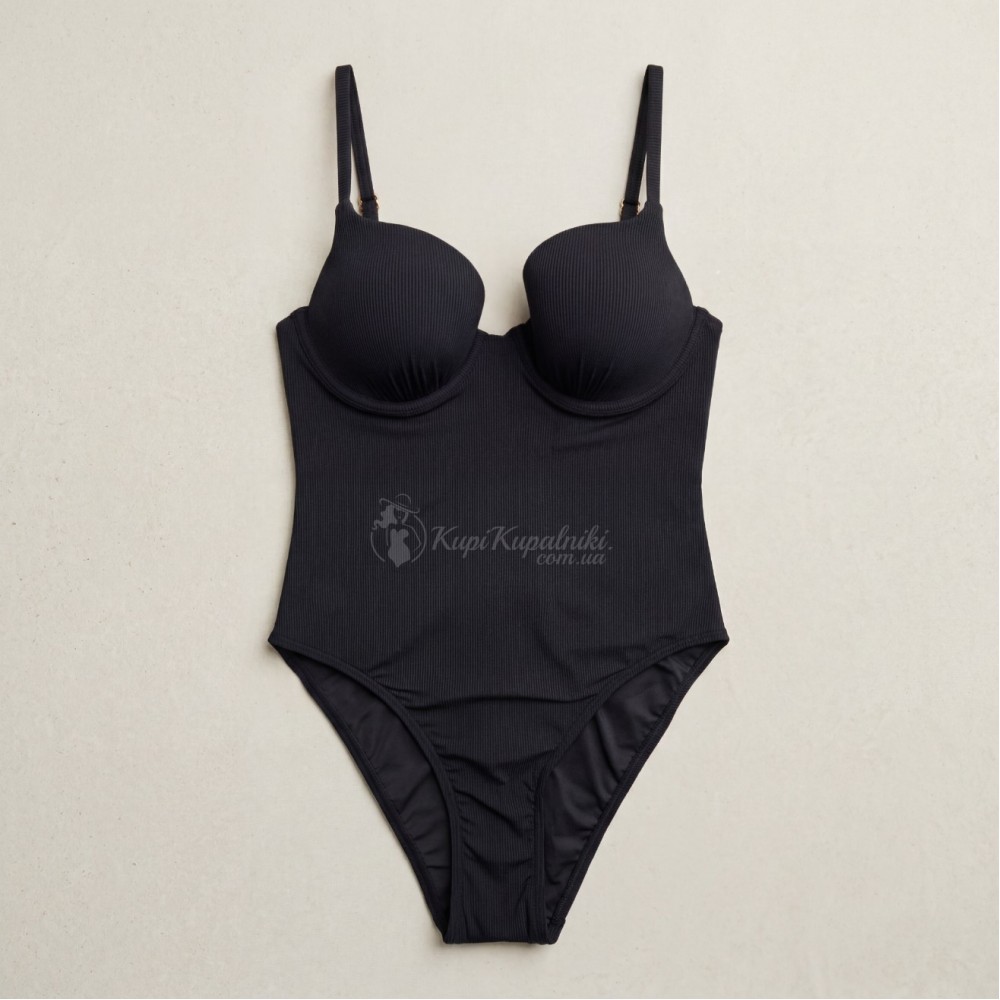 Этот чёрный слитный купальник с двойным пуш-ап поможет подчеркнуть фигуру, сделать декольте более выразительным и создать элегантный пляжный образ.