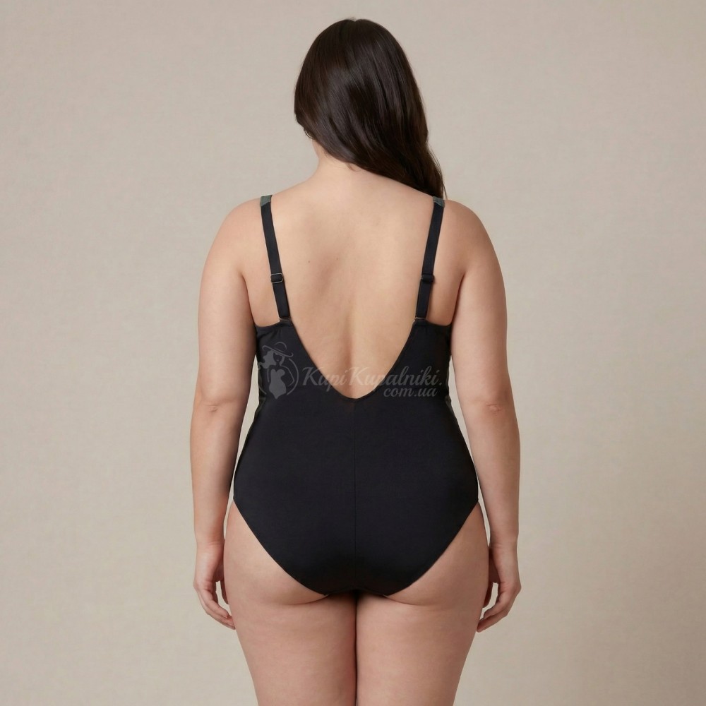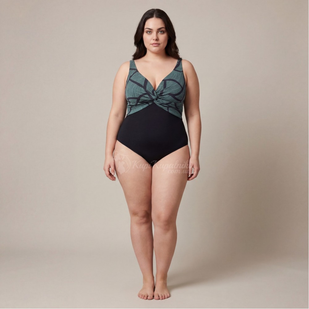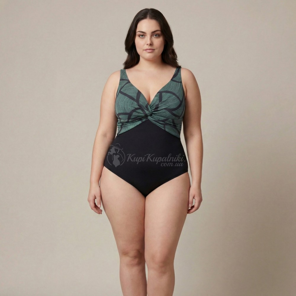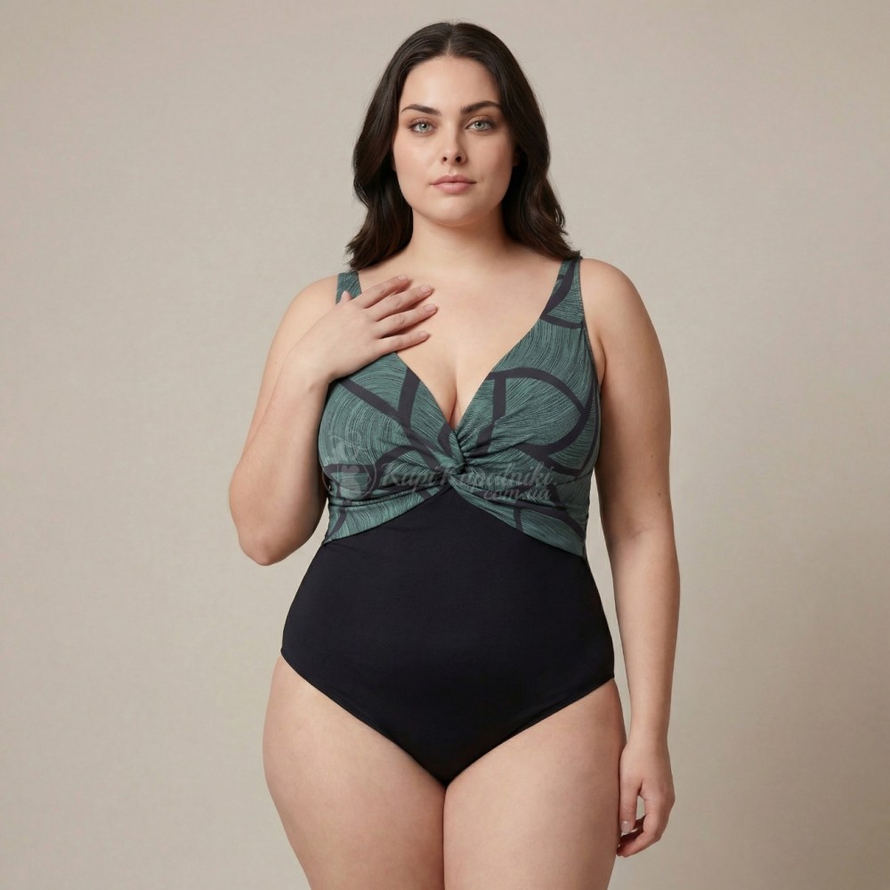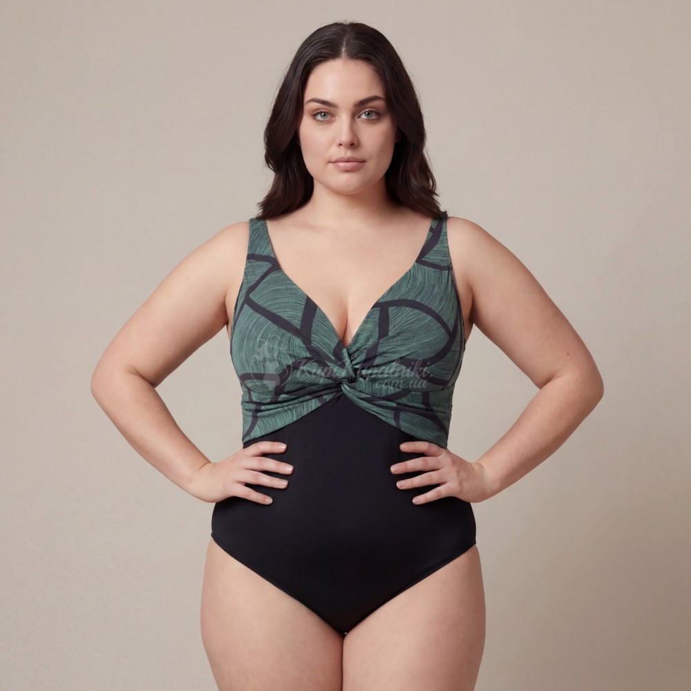 Эффектный слитный купальник Plus Size с выразительным абстрактным принтом — стильный выбор для пляжа, бассейна и отдыха у моря. Верх модели выполнен в зелёно-чёрной гамме с графичным рисунком, который смотрится современно и делает образ более заметным. Однотонная чёрная нижняя часть визуально уравновешивает силуэт и придаёт модели элегантный вид.