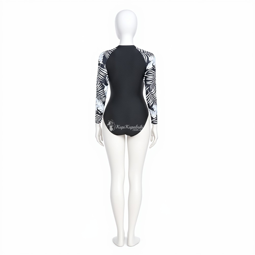Слитный спортивный купальник с длинными рукавами и молнией — идеальный выбор для активного отдыха, серфинга и плавания в прохладной воде. Контрастные рукава и боковые панели с тропическим принтом зрительно формируют талию, а центральная молния облегчает переодевание и позволяет регулировать глубину выреза. Плотная эластичная ткань с подкладкой дарит уверенную посадку и комфорт в движении.