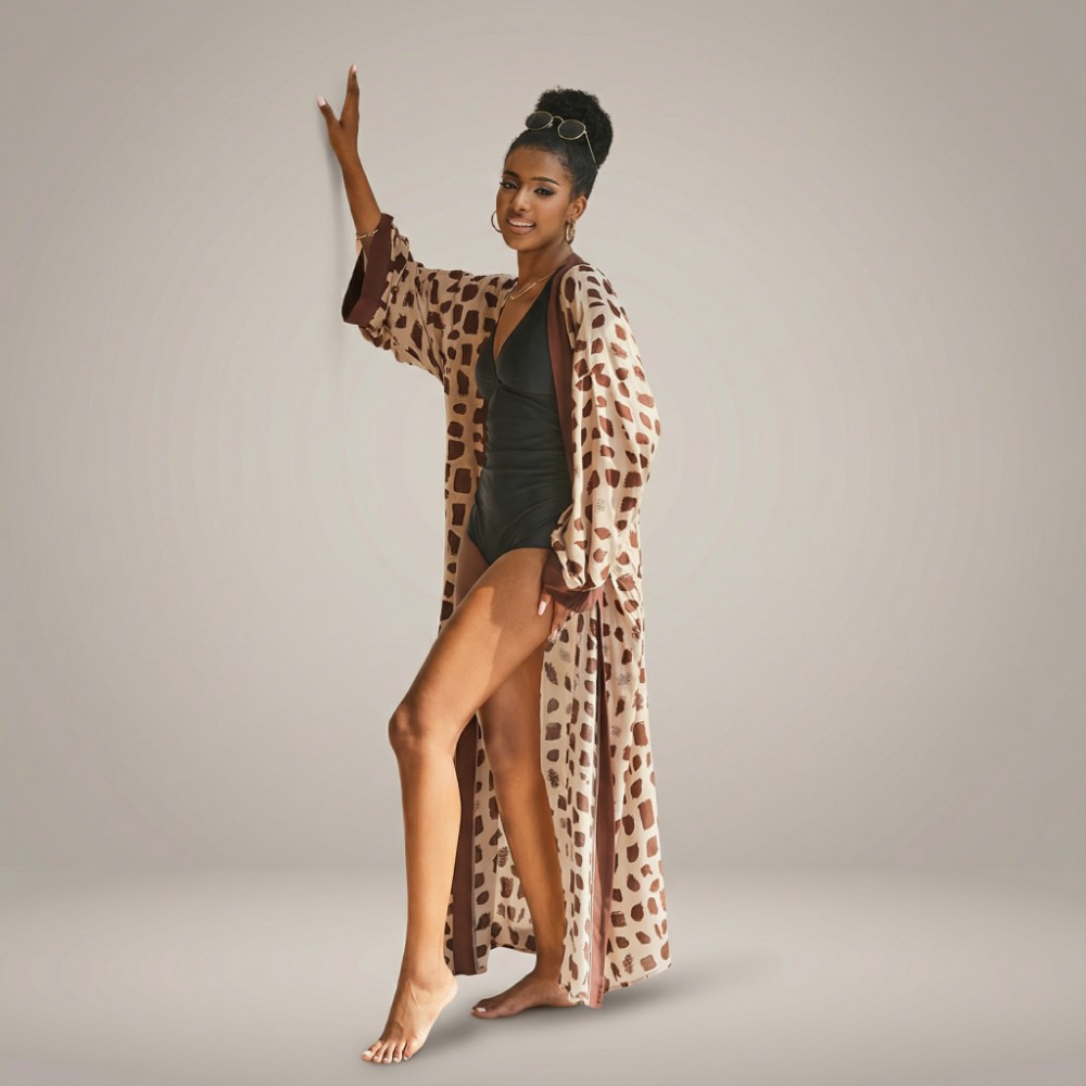 Элегантная Туника-Халат с Поясом | Стильный Принт Жираф | Изысканное Пляжное Платье Роскошная туника-халат с изысканным принтом под жирафа в нежных бежево-коричневых тонах — идеальное воплощение элегантности и пляжного шика. Натуральная вискоза создает невероятное ощущение легкости и прохлады даже в самую жаркую погоду, а свободный крой макси-длины с поясом обеспечивает комфортную посадку. Изящный принт с пятнами жирафа в спокойной бежево-коричневой гамме создает утонченный и элегантный образ, а контрастная окантовка подчеркивает детали модели. Характеристики: ✅ Материал: натуральный штапель (100% вискоза) ✅ Размер: One Size (универсальный) ✅ Длина: макси, до щиколотки ✅ Посадка: свободный крой оверсайз ✅ Рукав: длинные широкие рукава ✅ Детали: V-образный вырез с запахом, пояс на завязках, контрастная окантовка, принт жираф ✅ Цвета: бежевый, коричневый в принт жираф Преимущества модели: ✅ Ткань с эффектом прохлады — идеальна для жаркой погоды, создает комфорт весь день ✅ Натуральный состав (100% вискоза) — кожа дышит и остается свежей ✅ Свободная посадка — комфорт для любой фигуры, деликатно скрывает недостатки силуэта ✅ Универсальный размер — подходит на разные типы фигур ✅ Пояс на завязках — позволяет регулировать силуэт по желанию ✅ Элегантная бежево-коричневая гамма — универсальна и изысканна ✅ Легкая и невесомая — удобно носить весь день и брать в путешествие ✅ Рекомендуется деликатная стирка при 30°C для сохранения формы и мягкости ткани Эта туника-халат станет элегантной вещью для летнего отдыха — носите как пляжное платье на купальник, для утренних прогулок или отдыха у бассейна. Изысканный принт под жирафа в нежных бежево-коричневых тонах создает утонченный и стильный образ, который подчеркивает хороший вкус. Код товара: 405-94
