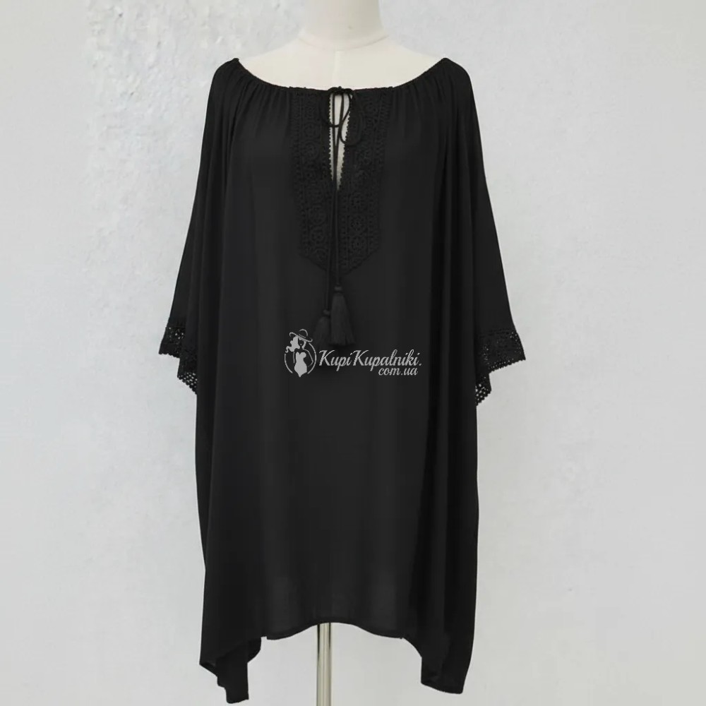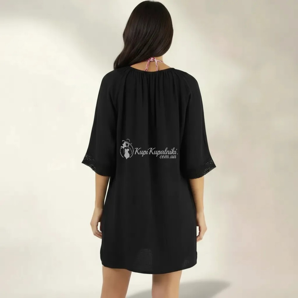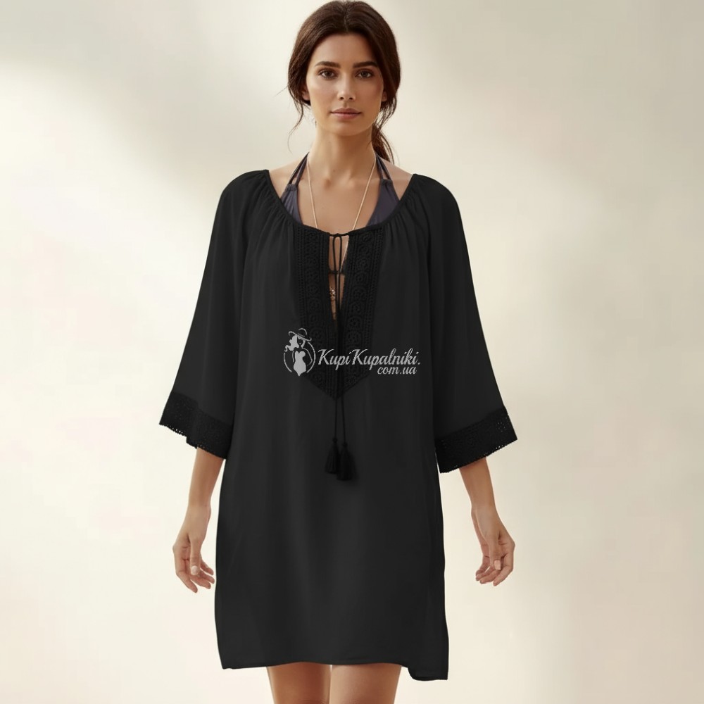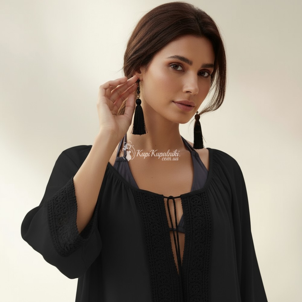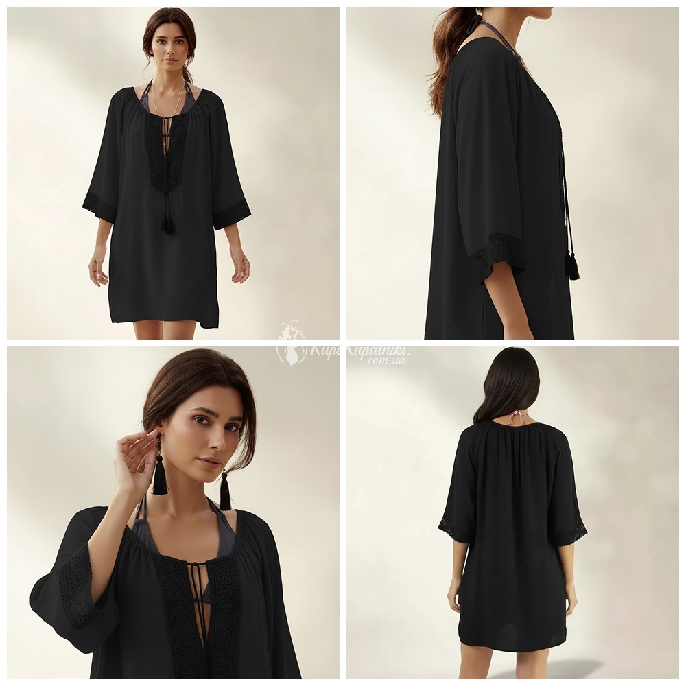 Глибокий V-подібний виріз оздоблений вишуканим мереживом і тонкими зав’язками з китицями — можна регулювати глибину вирізу під настрій. Рукави ¾ з акуратною мереживною каймою, довжина до середини стегна — зручно накинути поверх купальника або носити як легку літню сукню. Чорний колір робить образ лаконічним і шляхетним.