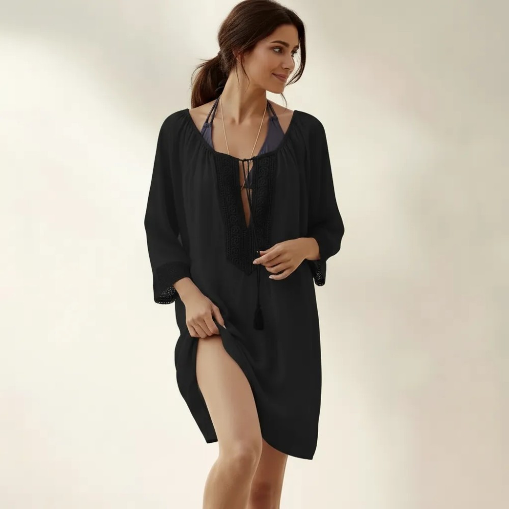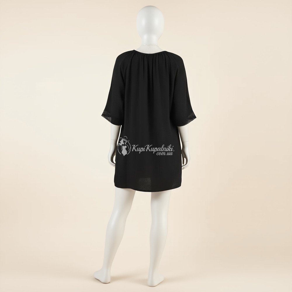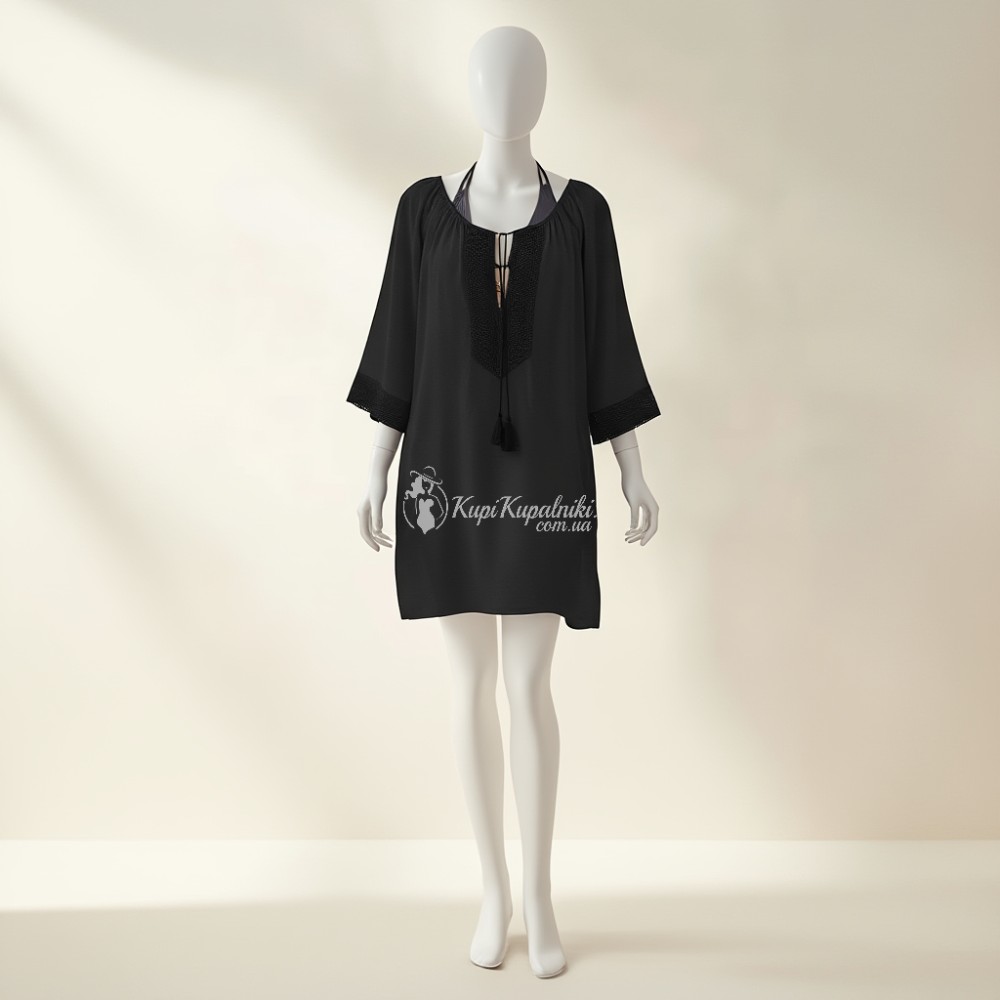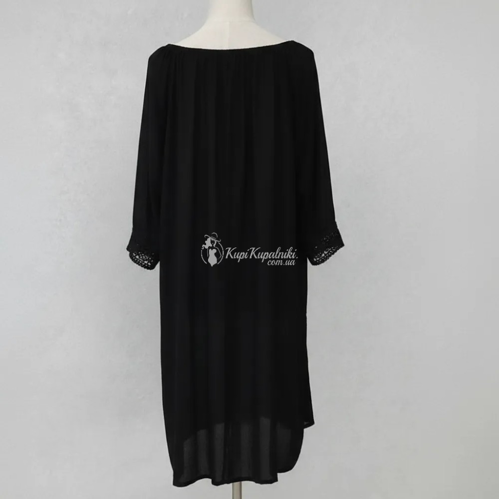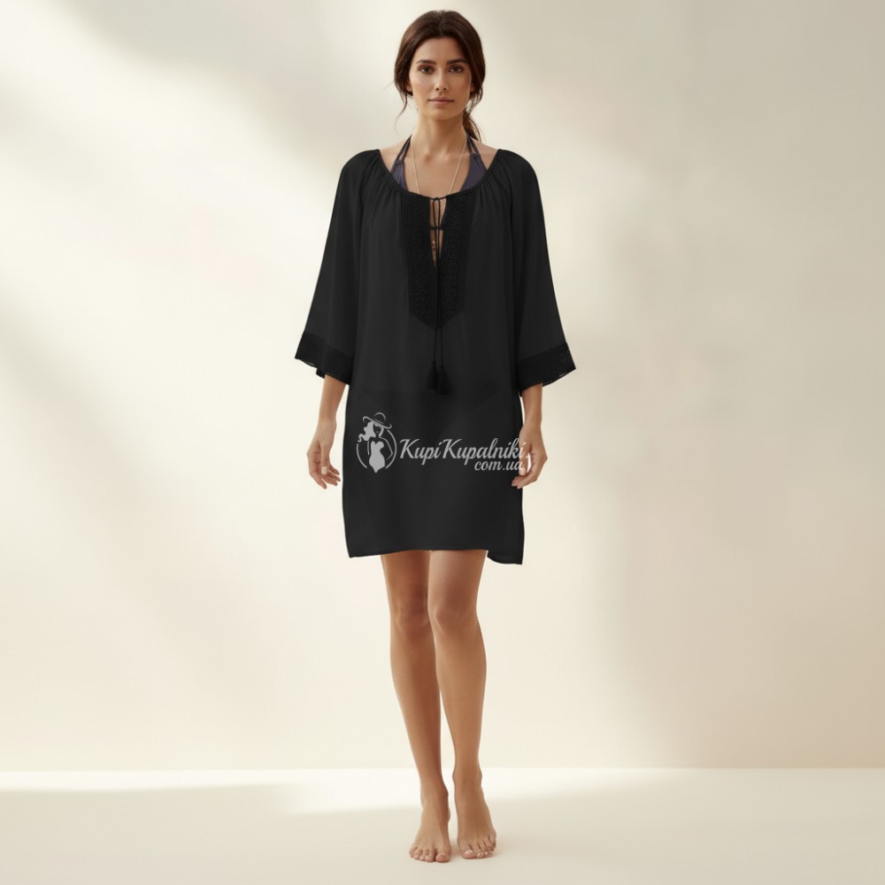 Глибокий V-подібний виріз оздоблений вишуканим мереживом і тонкими зав’язками з китицями — можна регулювати глибину вирізу під настрій. Рукави ¾ з акуратною мереживною каймою, довжина до середини стегна — зручно накинути поверх купальника або носити як легку літню сукню. Чорний колір робить образ лаконічним і шляхетним.