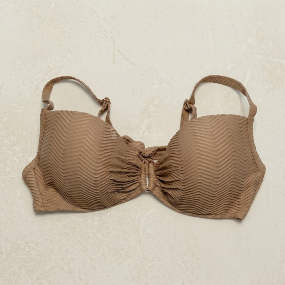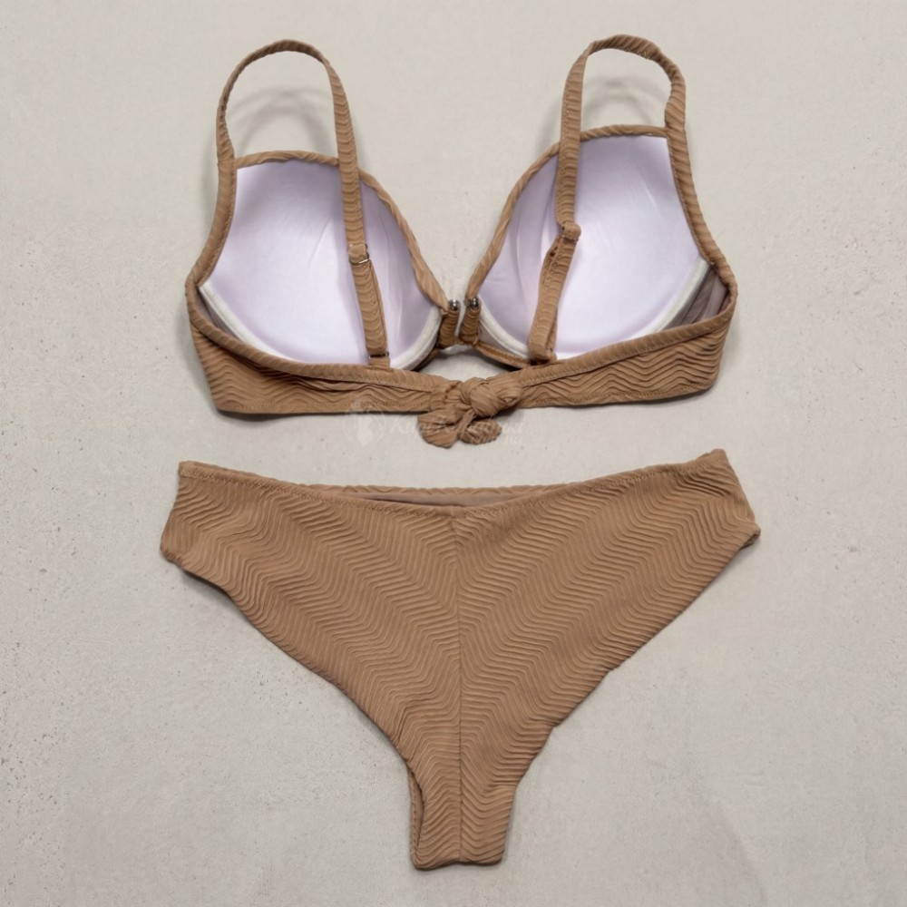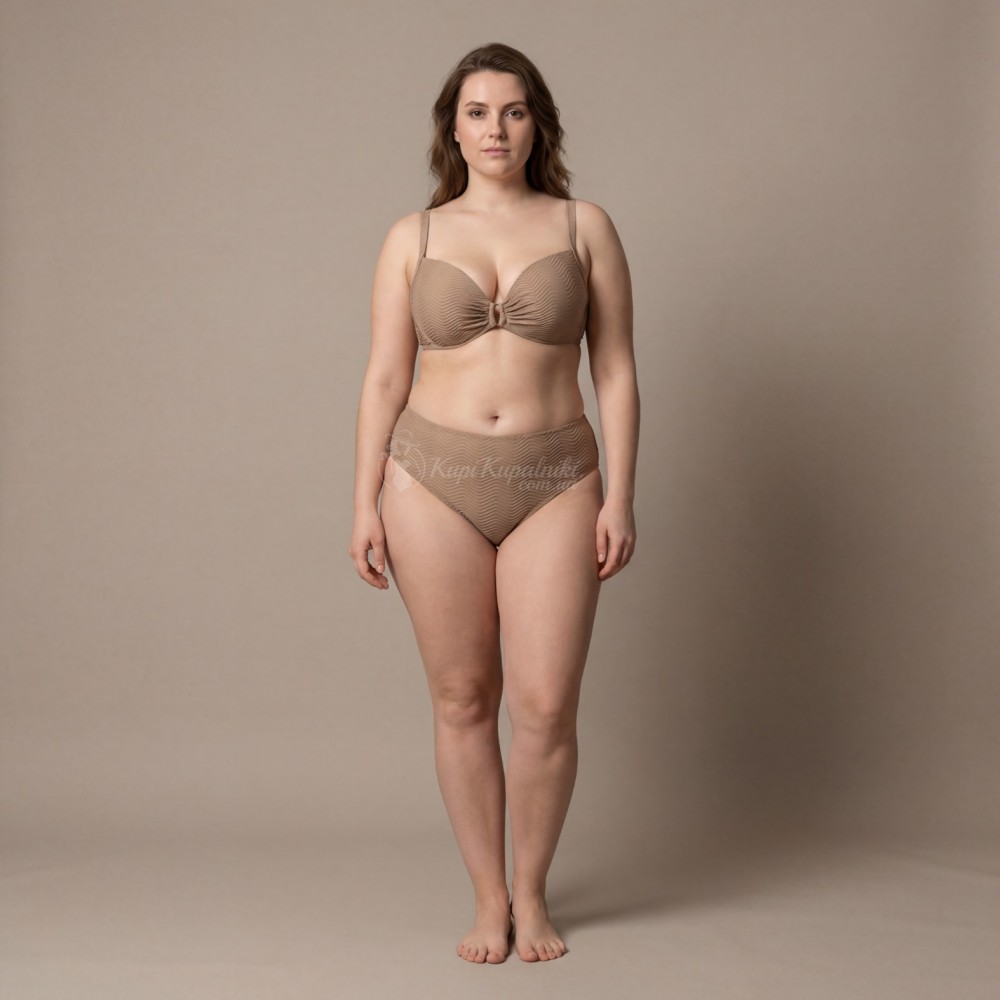 Елегантний роздільний купальник у бежевому відтінку — універсальний вибір для стильного пляжного образу. Ліф із формованими чашками красиво підкреслює груди, створює акуратне декольте та забезпечує комфортну підтримку. Фактурна тканина з делікатним рельєфом робить модель візуально дорожчою й ефектнішою, а трусики з високою посадкою допомагають м’яко підкреслити талію та витягнути силует.