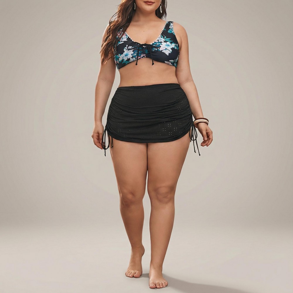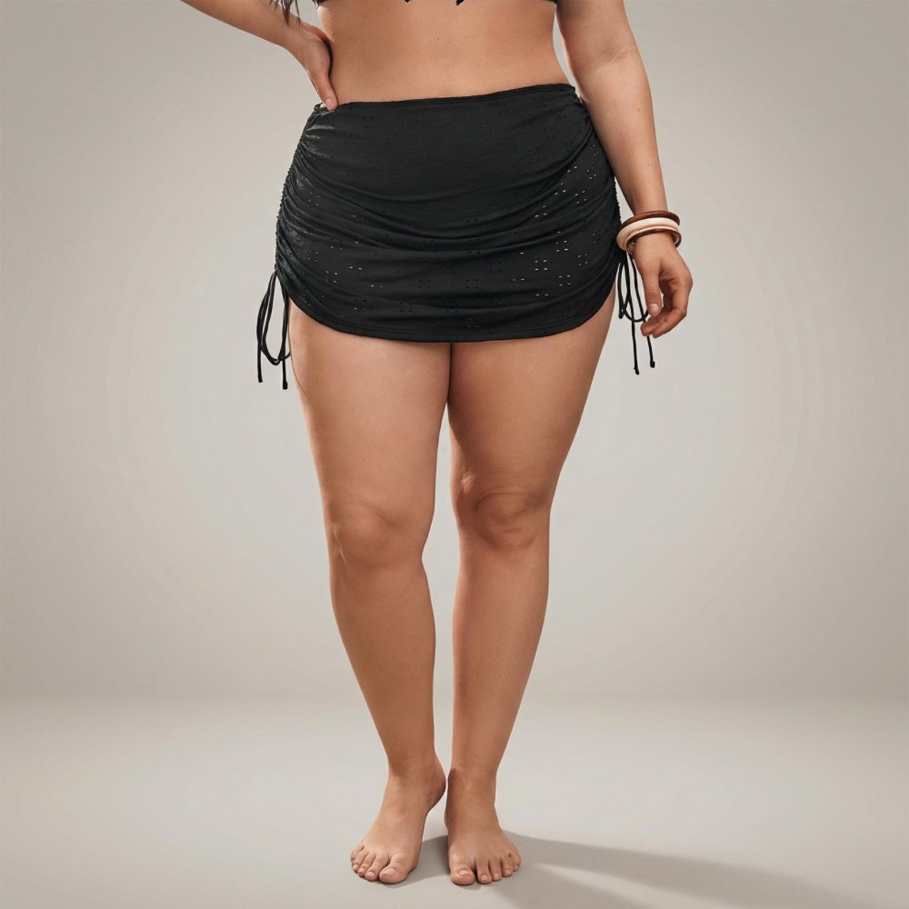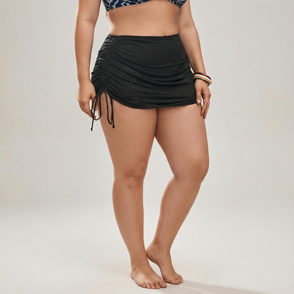 Ці стильні купальні плавки зі спідницею у класичному чорному кольорі з ефектною перфорацією стануть універсальним доповненням до будь-якого топа від купальника. Модель із високою талією та широким поясом забезпечує утягуючий ефект і підтримку, а елегантна спідниця з драпіруванням та регульованими шнурівками по боках дозволяє створити бажаний силует. Перфорована тканина додає текстури і стилю, а плавки під спідницею забезпечують повне покриття.