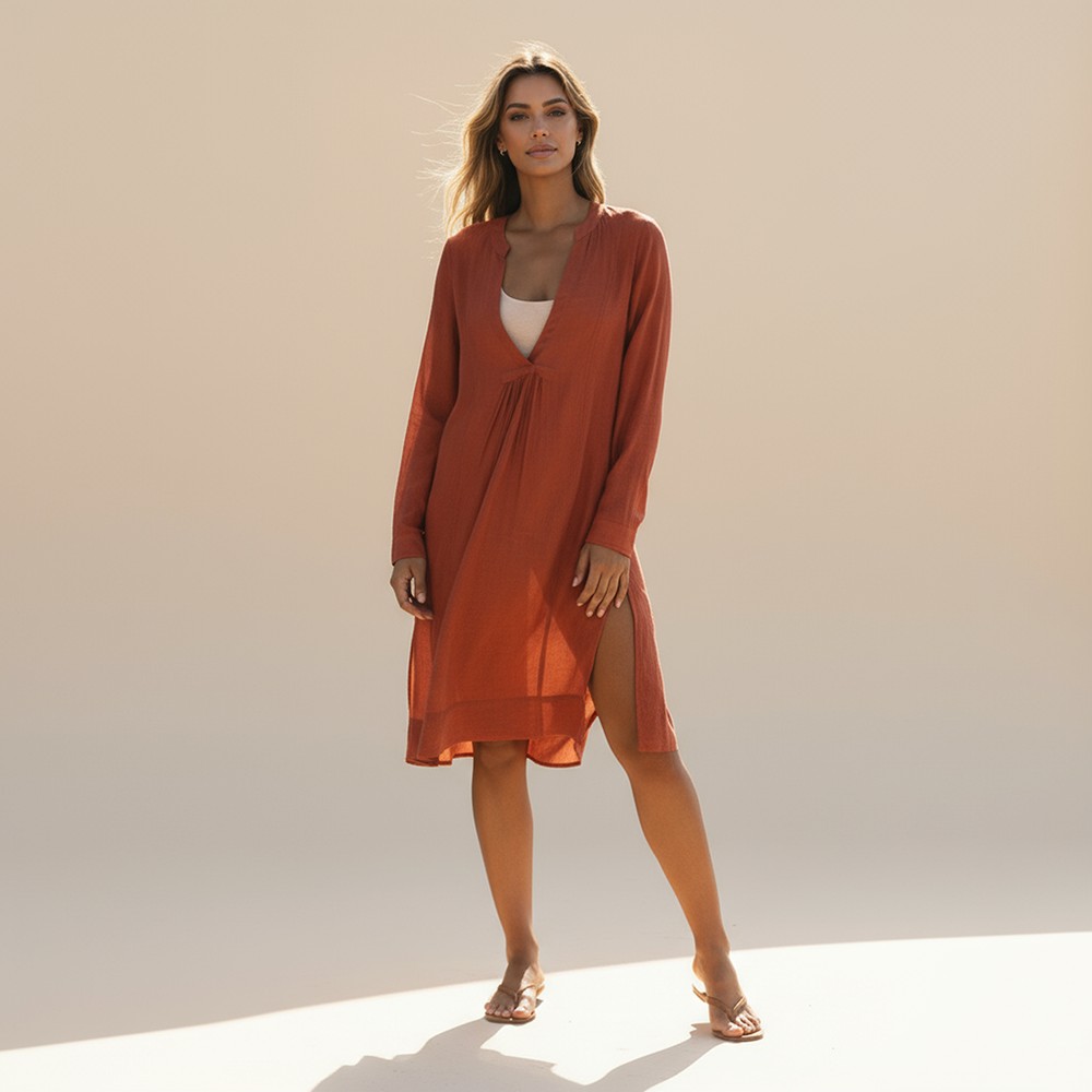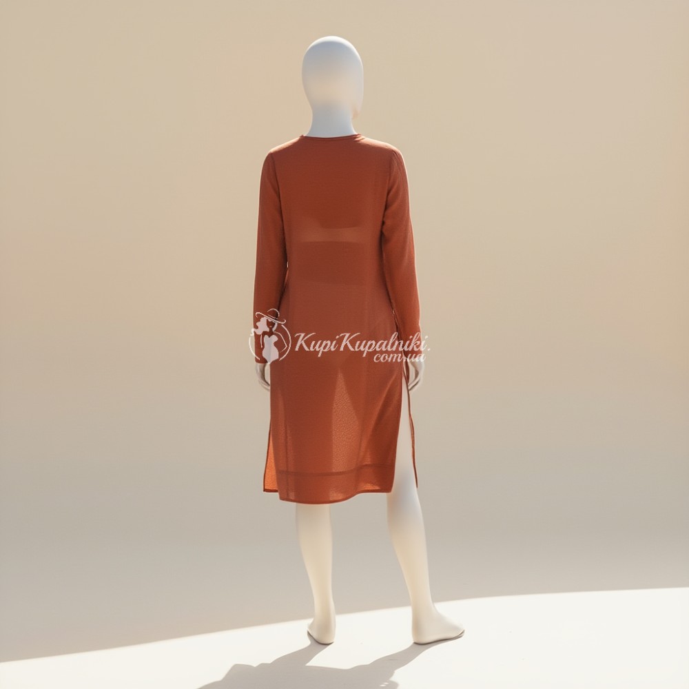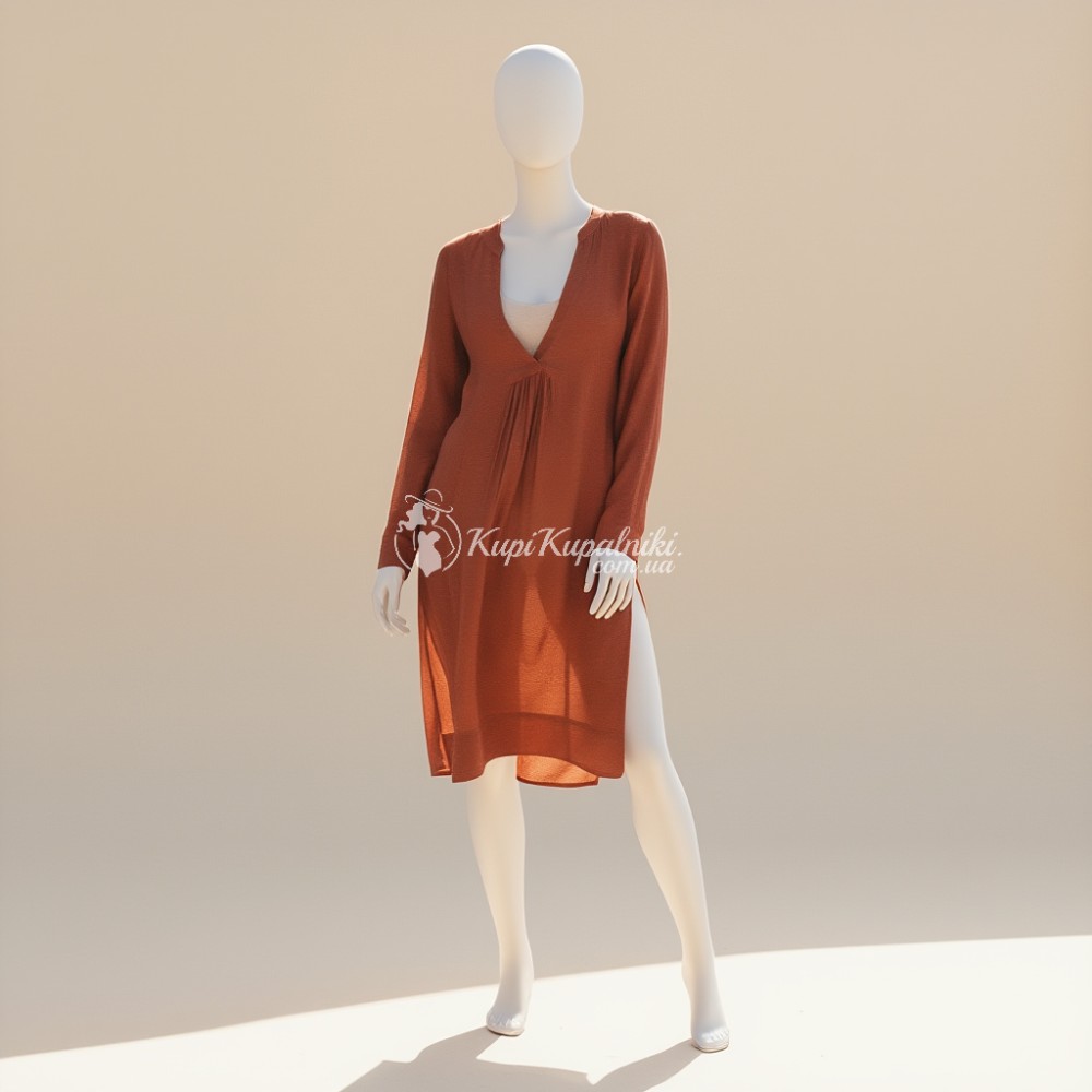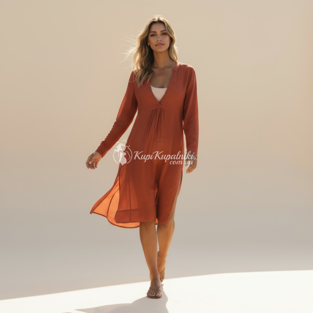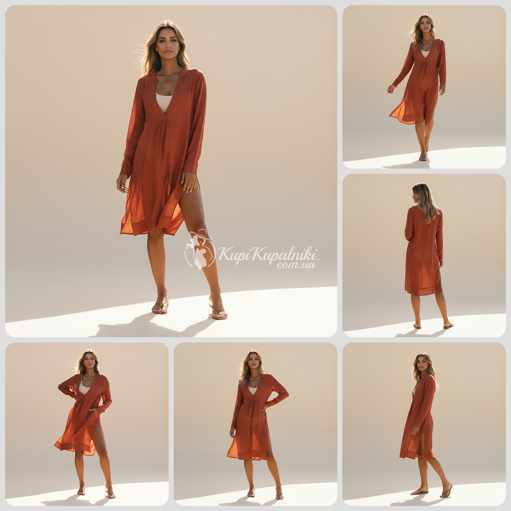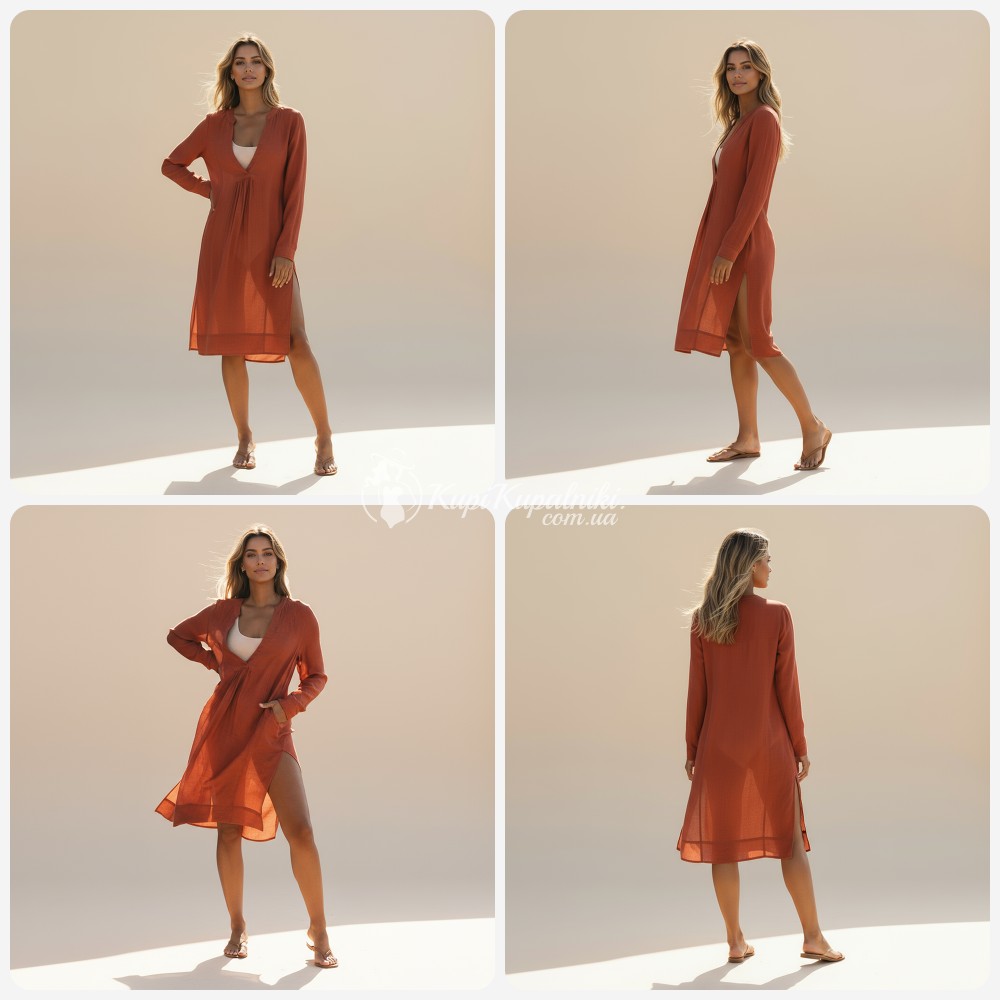 Жіноча пляжна туніка-сорочка у теплому теракотовому відтінку — ідеальний вибір для спекотних днів біля моря та прогулянок набережною. Легка напівпрозора тканина м’яко спадає та «дихає», а вільний крій гарно сидить на різних типах фігури. Глибокий V-подібний виріз і довгі рукави формують витончений силует, бічні розрізи додають легкості та свободи кроку.