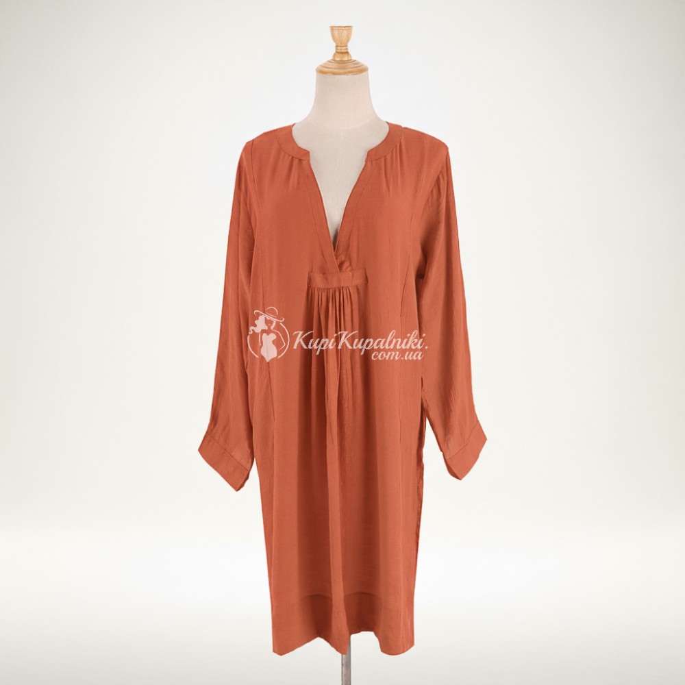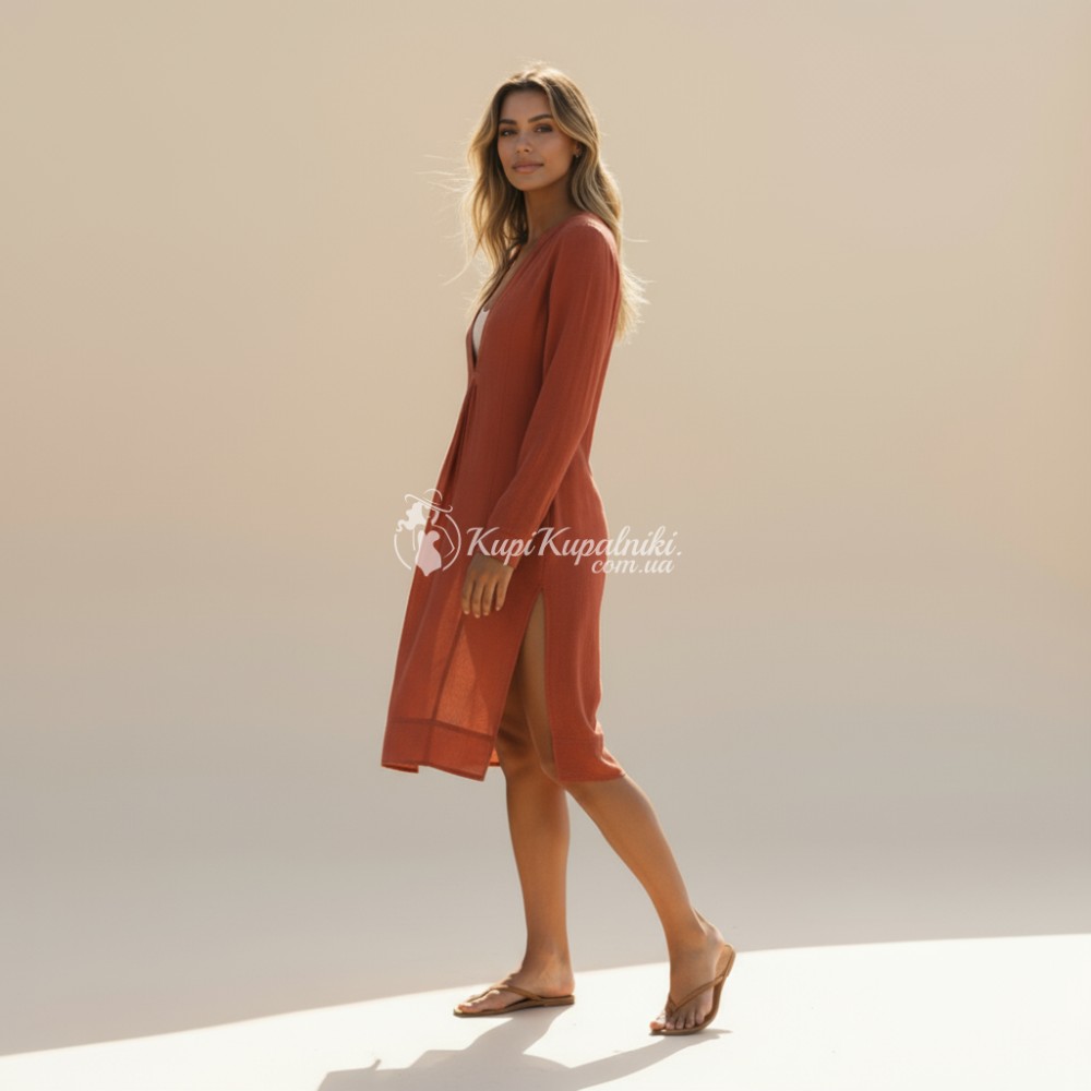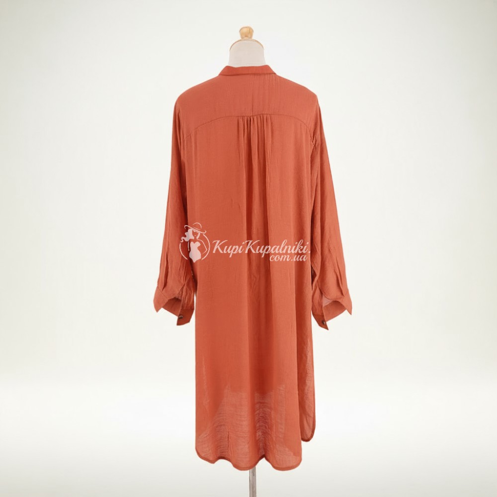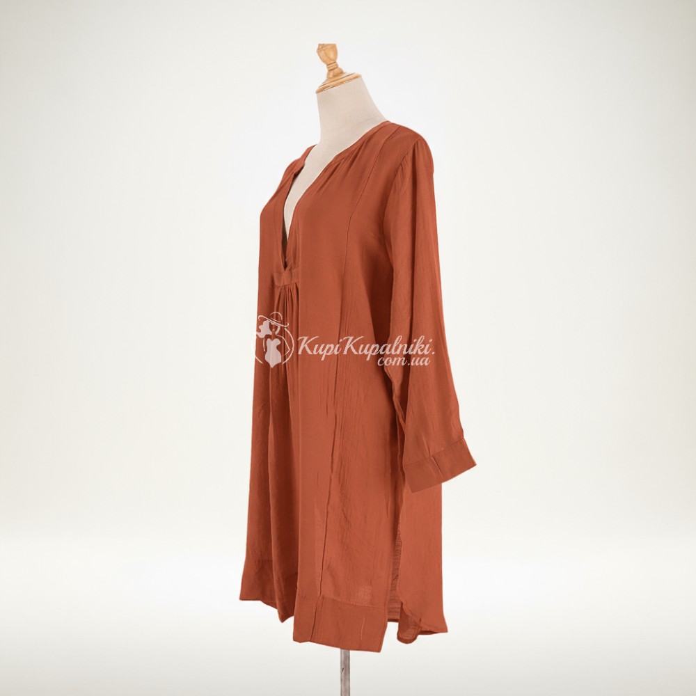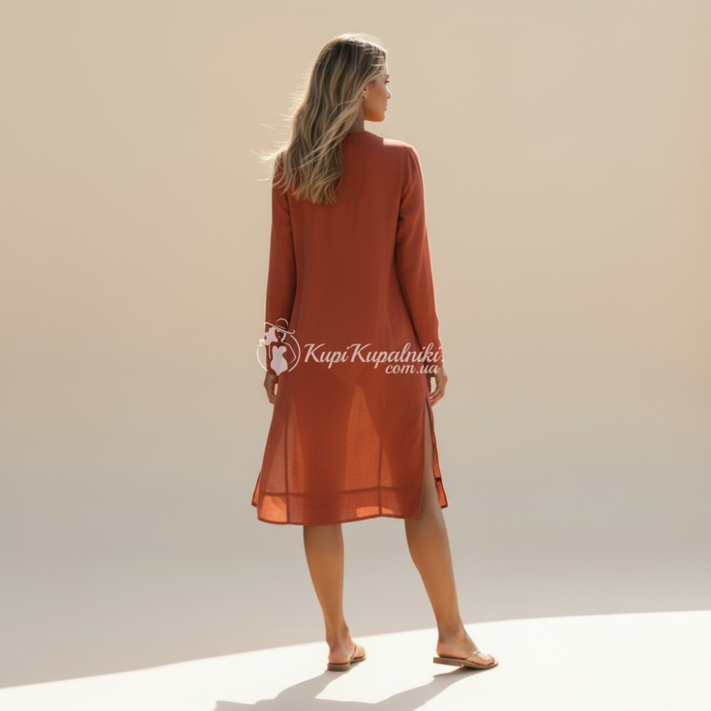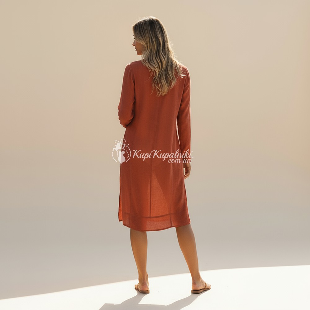 Пляжна туніка-сорочка теракотова, довгий рукав, розрізи 146-111-2