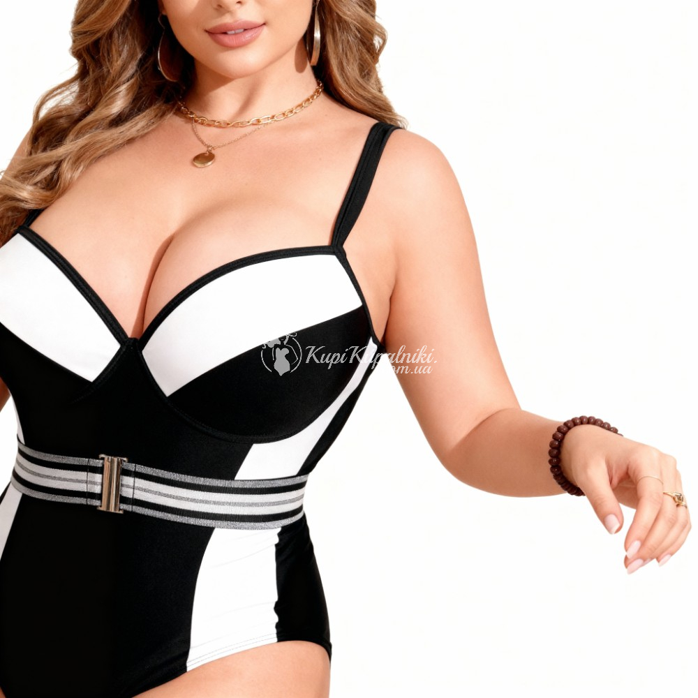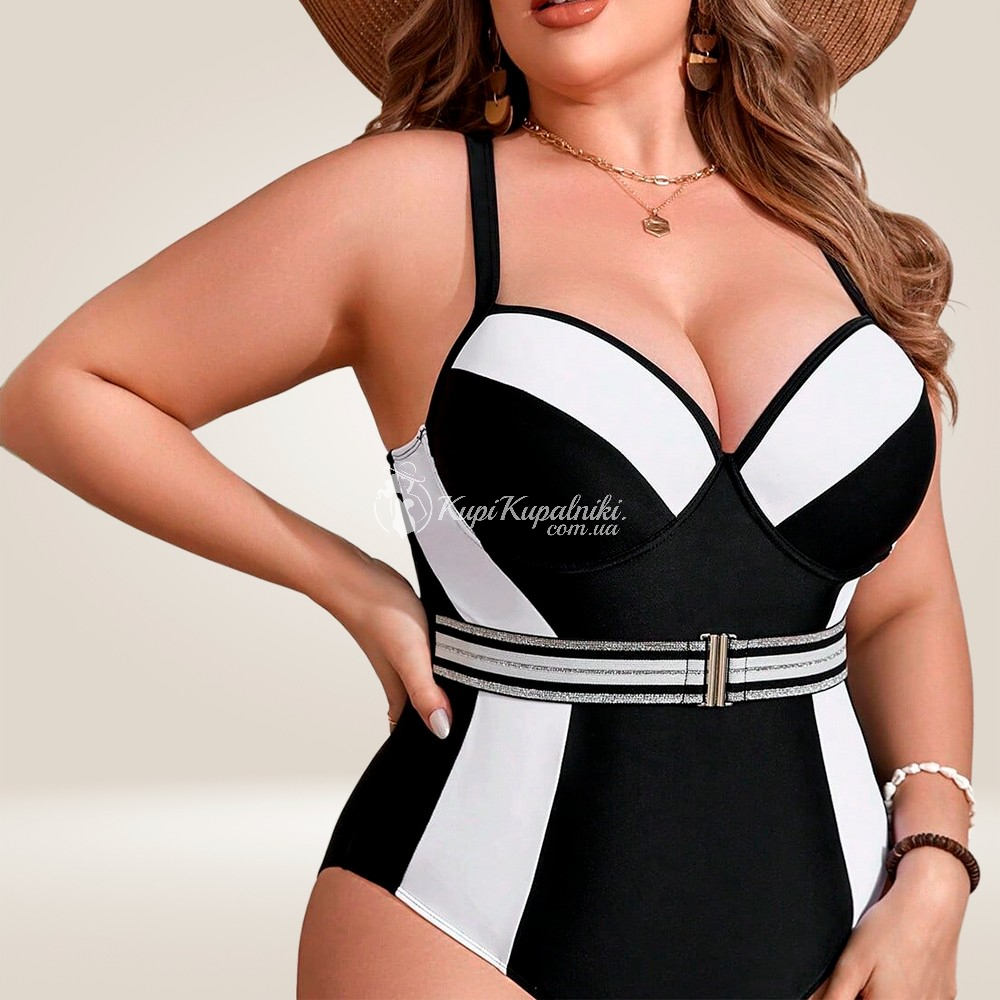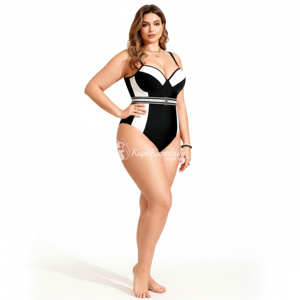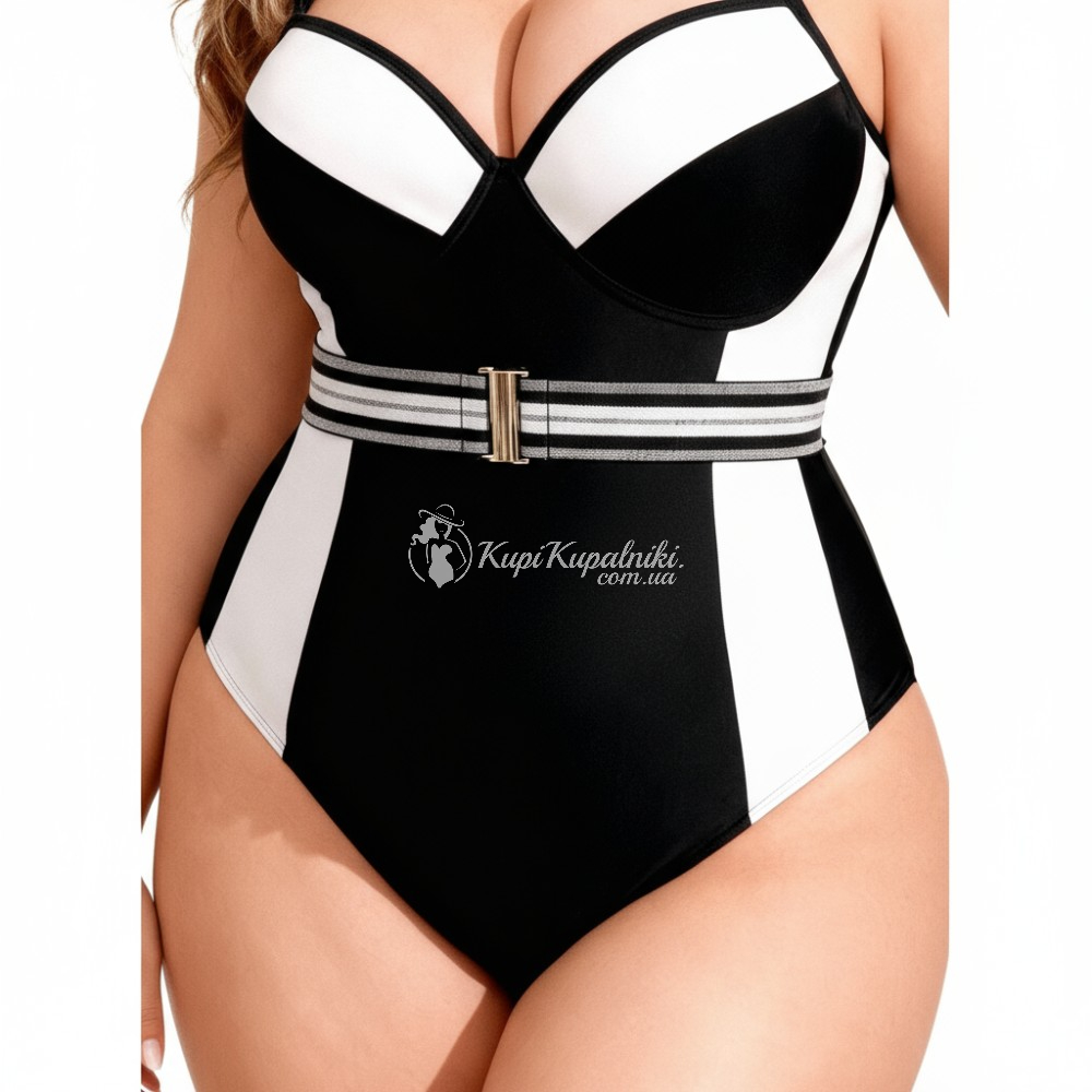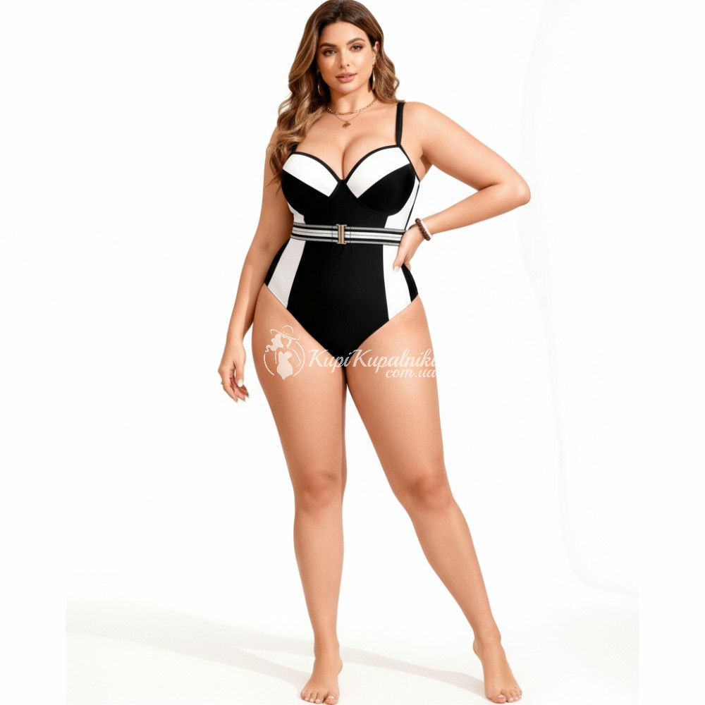 Суцільний купальник Plus Size чорно-білий із підтримкою та поясом 434-06