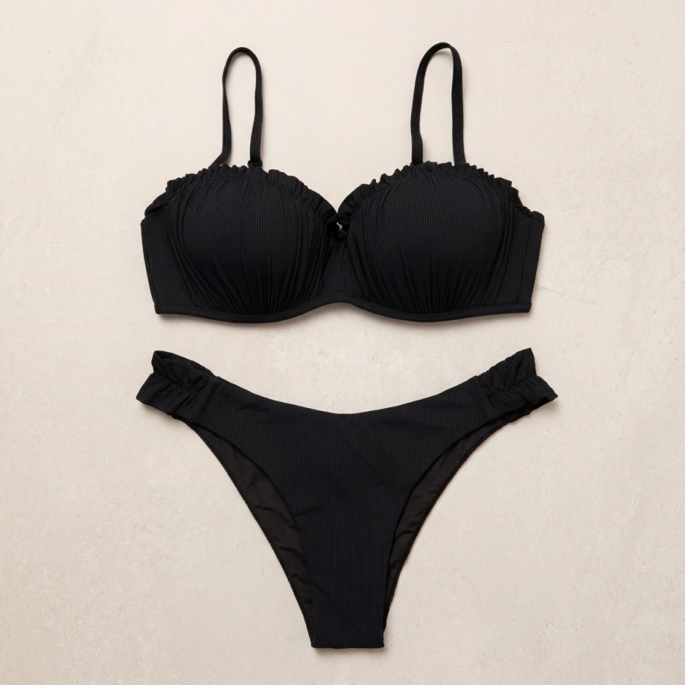 Стильный раздельный купальник в классическом чёрном цвете — эффектная и универсальная модель для пляжа, бассейна и летнего отдыха. Лиф с выразительной фактурой в рубчик и женственной линией декольте красиво подчёркивает грудь, а двойной пуш-ап помогает создать более собранный, объёмный и привлекательный силуэт. Благодаря лаконичному дизайну модель выглядит современно, элегантно и легко вписывается в любой курортный гардероб.