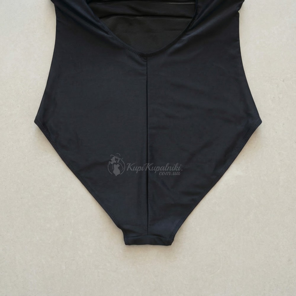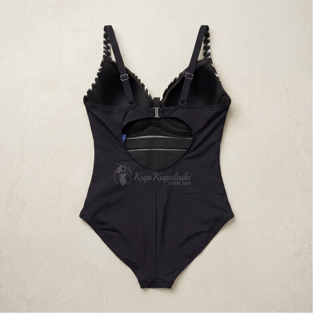 Модель выполнена в комфортном фасоне с мягкой поддержкой груди и регулируемыми бретелями. Под грудью расположены декоративные полупрозрачные вставки, которые добавляют лёгкий акцент и визуально подчёркивают талию. На спине — аккуратный овальный вырез и застёжка, благодаря чему купальник смотрится современно и женственно.