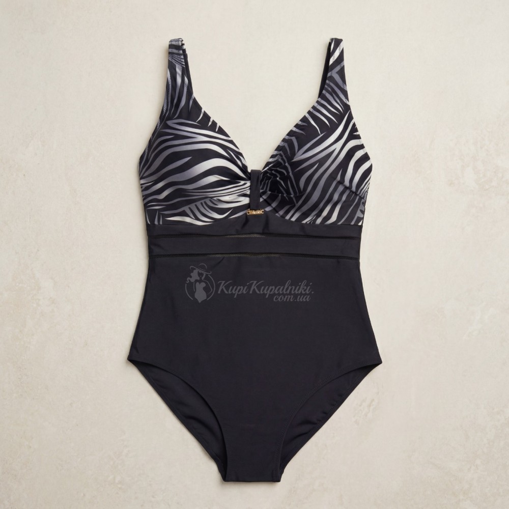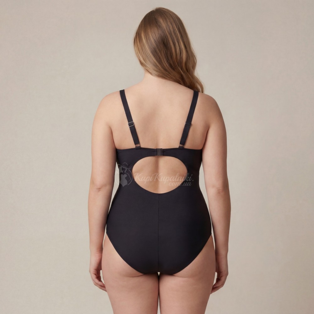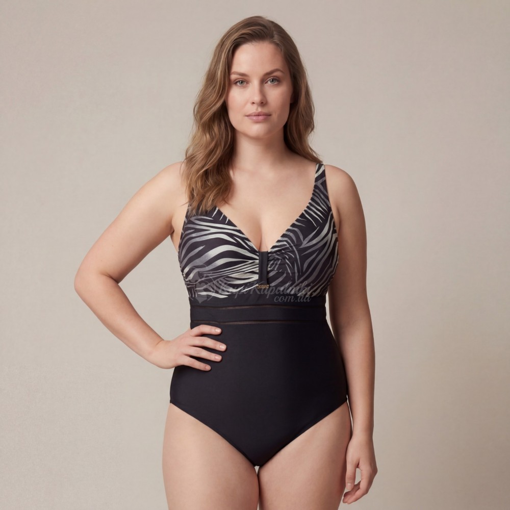 Стильный слитный купальник Plus Size в чёрном цвете с контрастным абстрактным принтом в верхней части — удачный выбор для пляжа, бассейна и отдыха у моря. Светло-серый графичный рисунок красиво освежает образ, привлекает внимание к зоне декольте и делает модель визуально более выразительной. Чёрная нижняя часть помогает сбалансировать силуэт и создаёт более стройное впечатление.