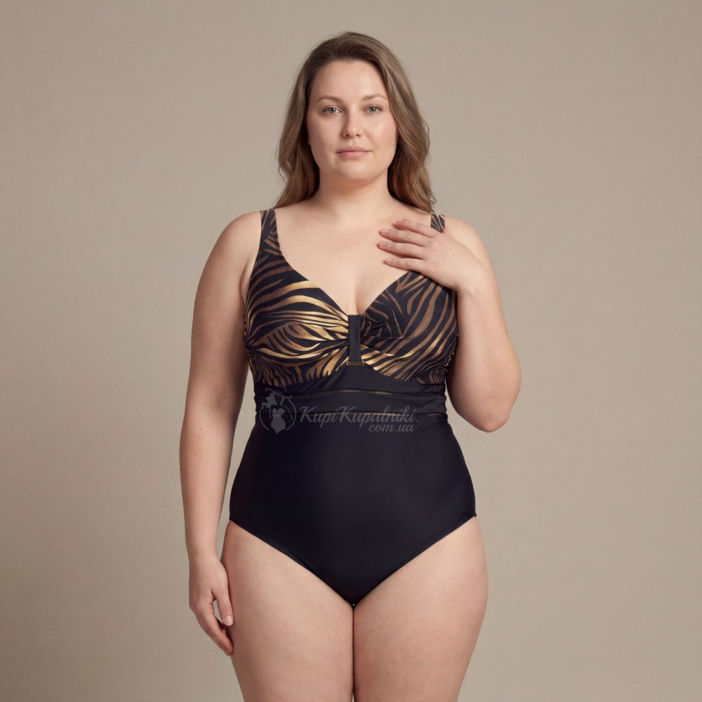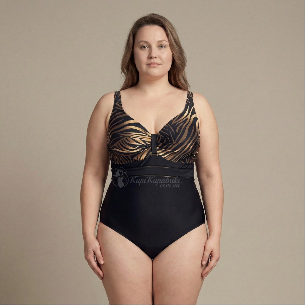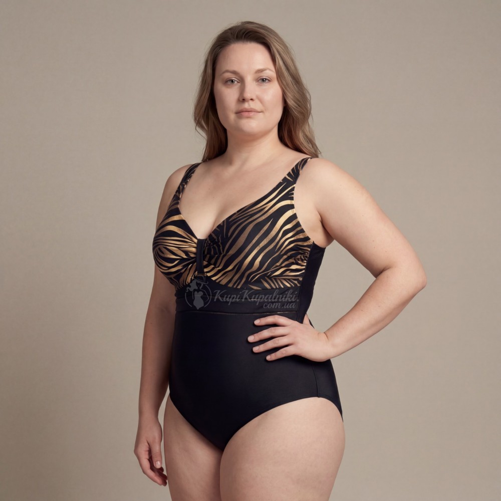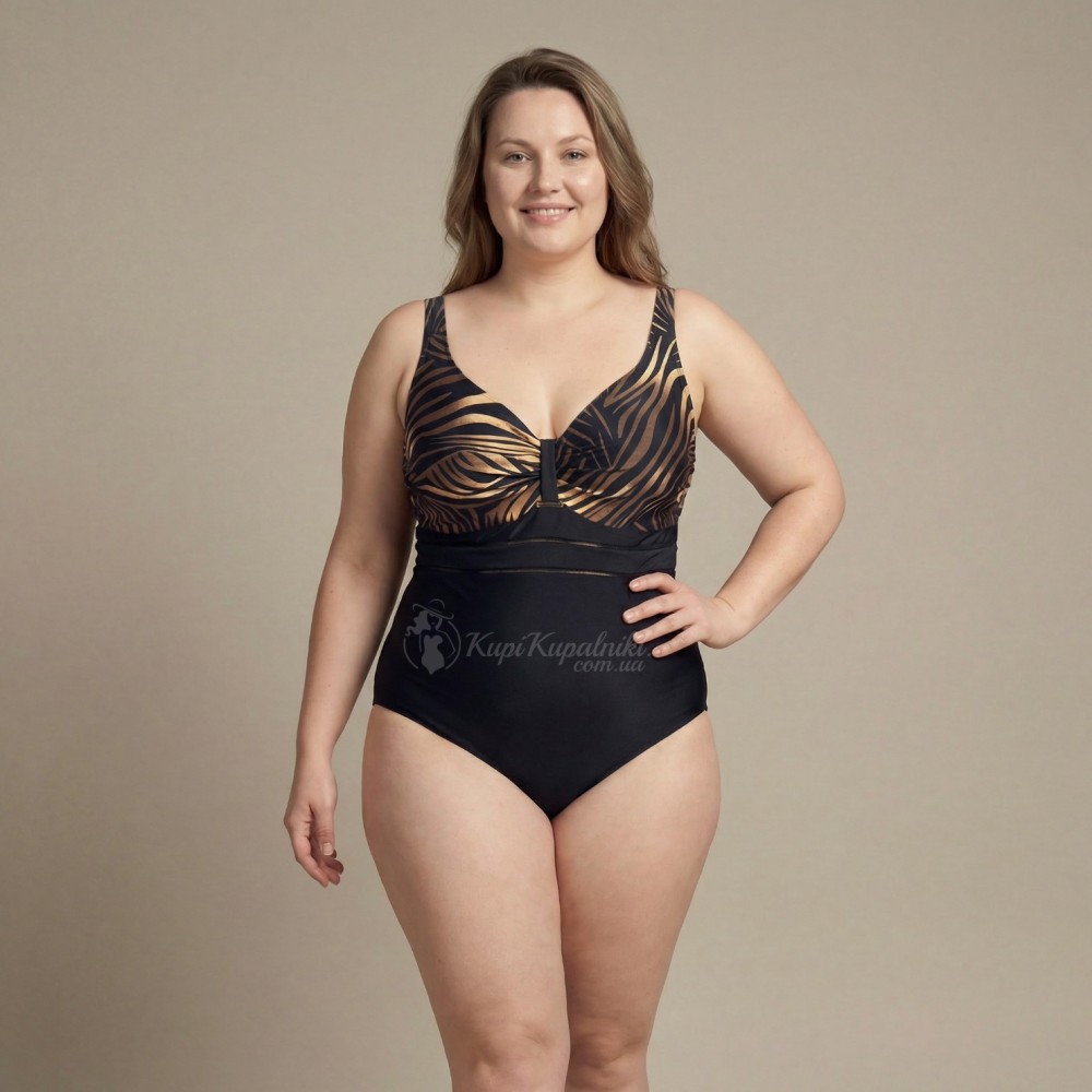 Слитный купальник Plus Size | Тёплый Зебра-Принт | Чёрная Основа и Эффектный Силуэт
