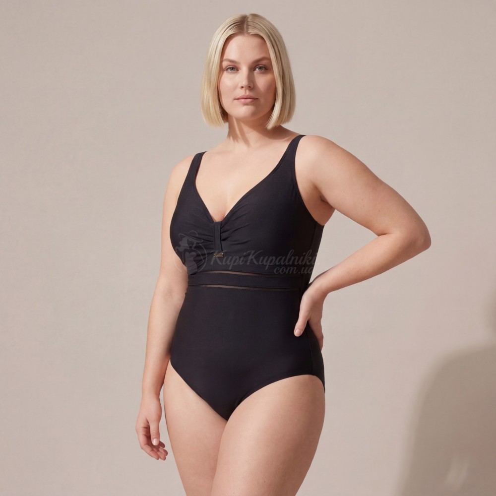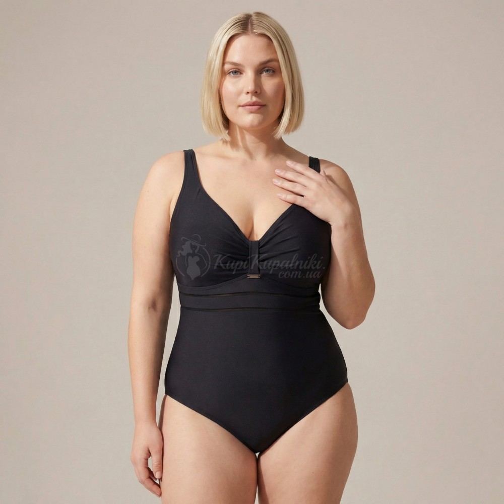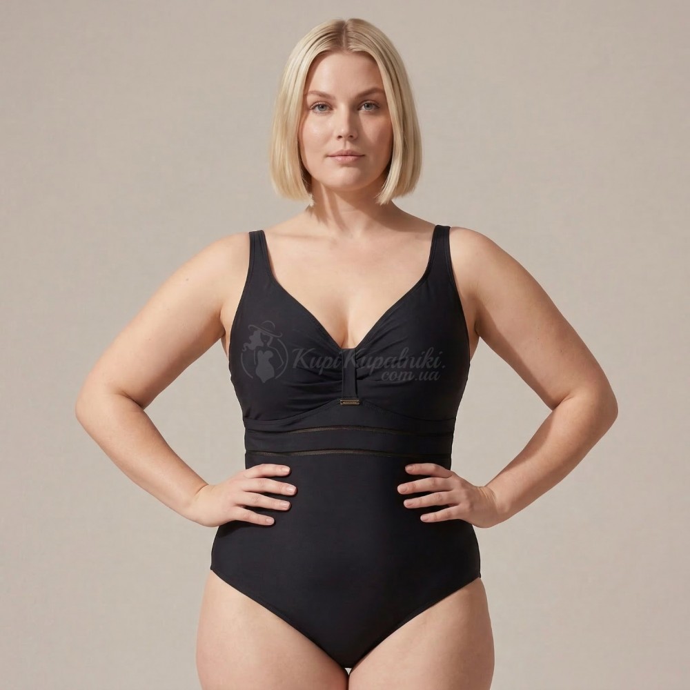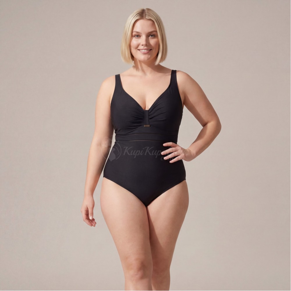 Элегантный слитный купальник Plus Size в чёрном цвете — универсальный вариант для пляжа, бассейна и отпуска. Лаконичный дизайн делает модель визуально стройнящей, мягкая сборка в зоне груди красиво подчёркивает декольте, а декоративная полупрозрачная вставка под грудью добавляет образу аккуратный акцент. Чёрный цвет всегда выглядит стильно и легко сочетается с пляжными накидками, рубашками и аксессуарами.